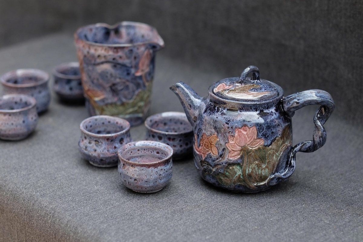She often prepares her own glazes — sometimes thick, sometimes delicate — creating surfaces where color shifts in depth and intensity. Firing in separate batches leads to unpredictable outcomes, and some collections take from the year’s beginning to its end to fully materialize.