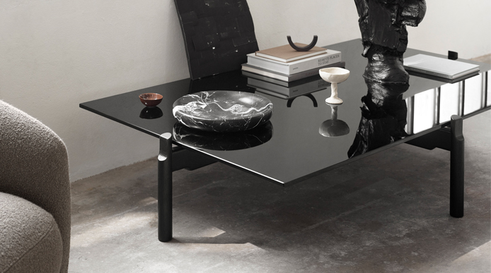 Crafted in black glass with slightly bevelled edges, the semi-transparent tabletop is resting atop a frame in black stained oak with visible grains, featuring remarkable notched cabinet maker details that elevate the design further.