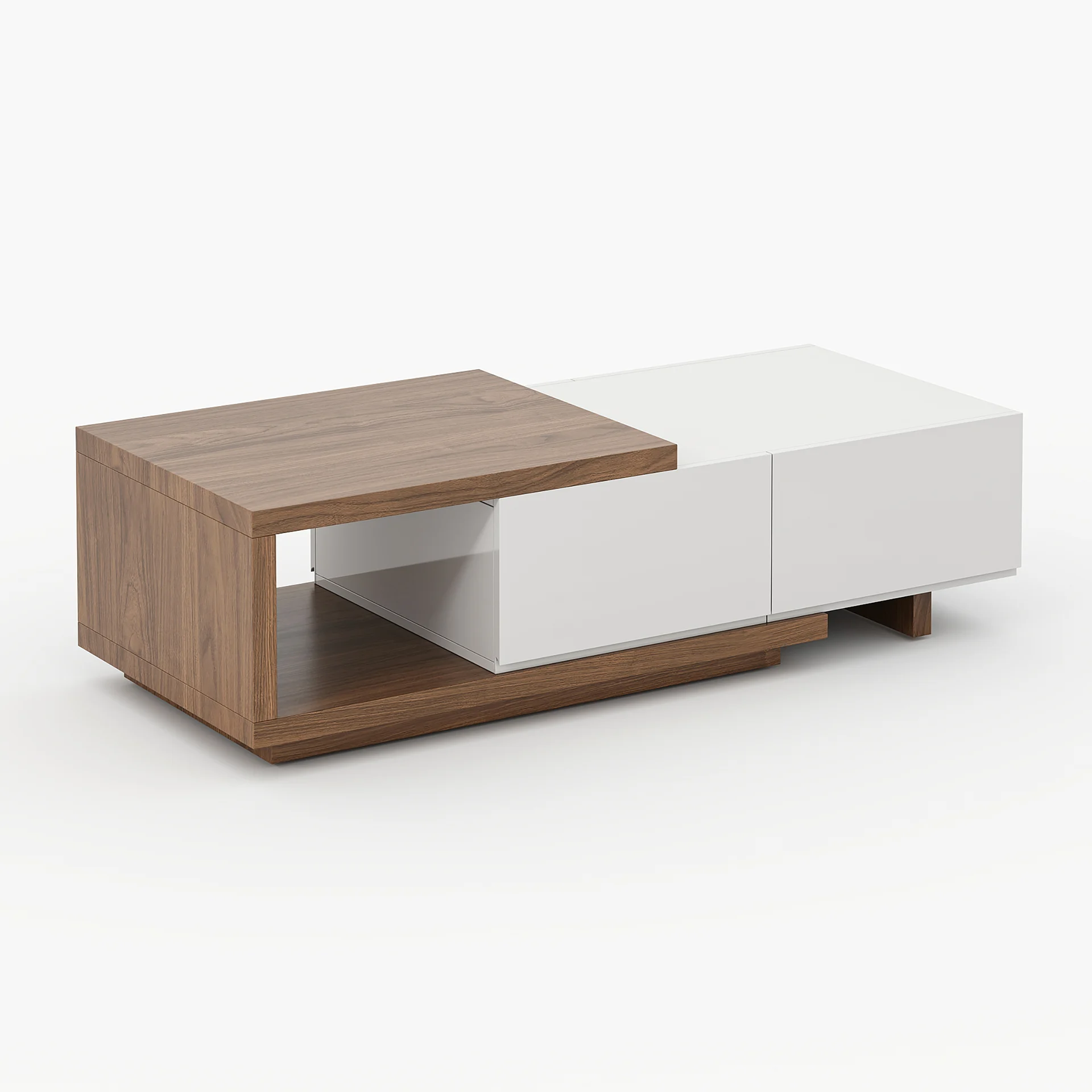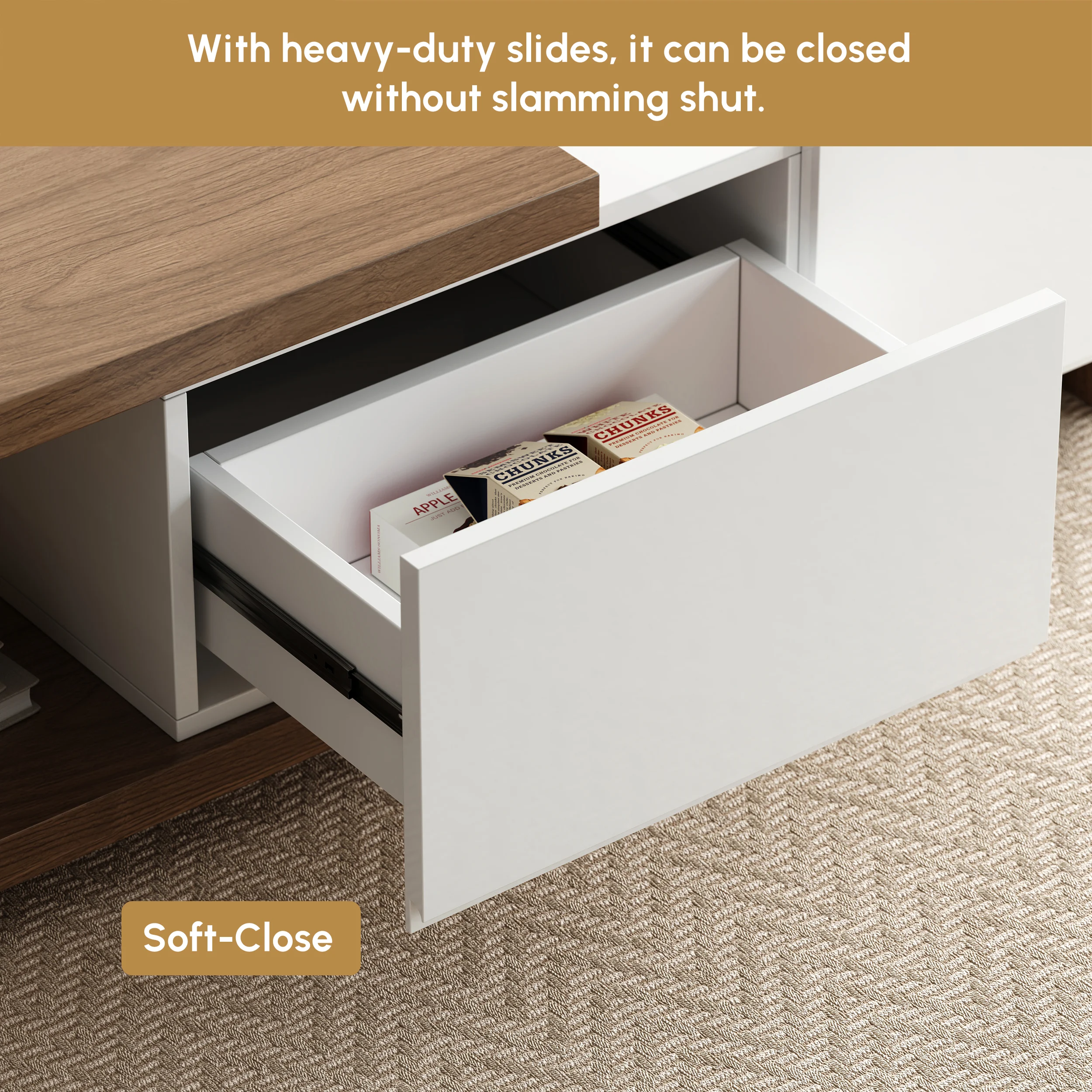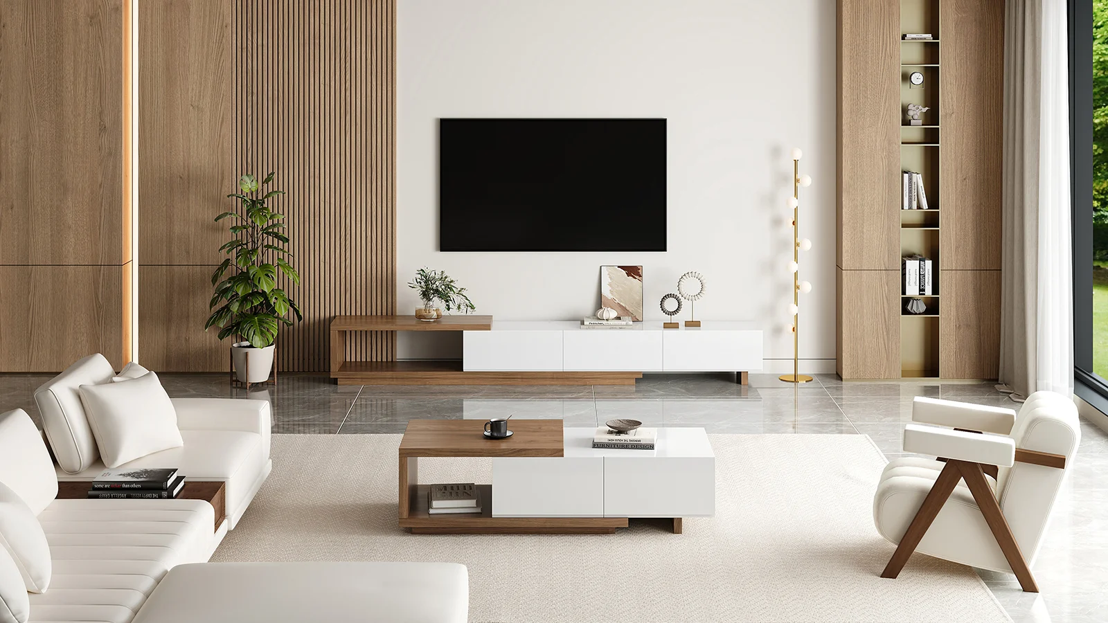Quoint TV Stand and Coffee Table Set combines rich wood tones with white finishes, creating a modern yet warm aesthetic. Perfect for contemporary living rooms seeking elegance and functionality.