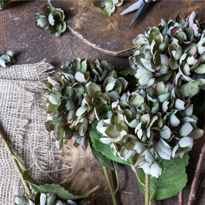 Our Artificial Hydrangea Chloris is sold as a single stem. Shown in the Erba Vase with 4 stems.