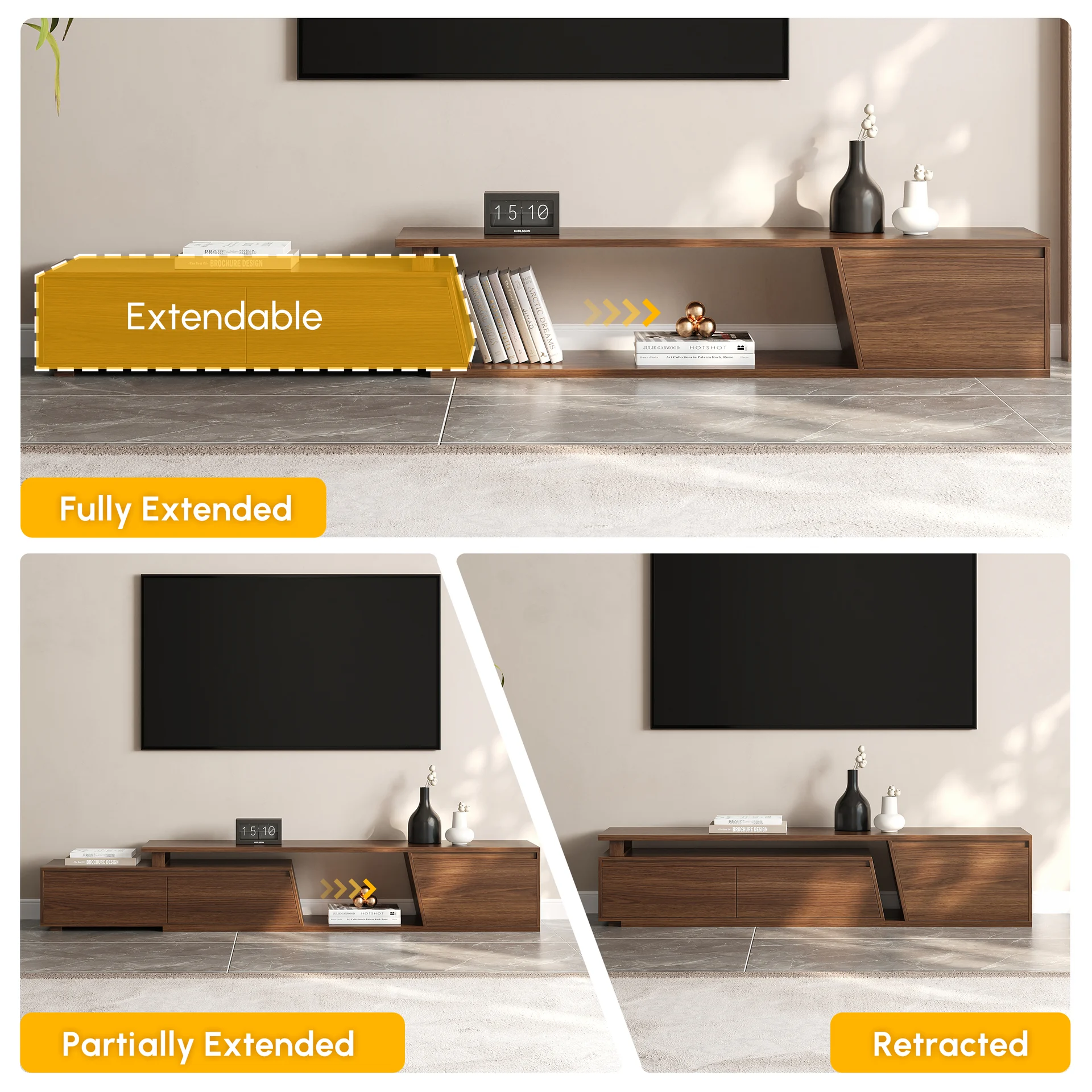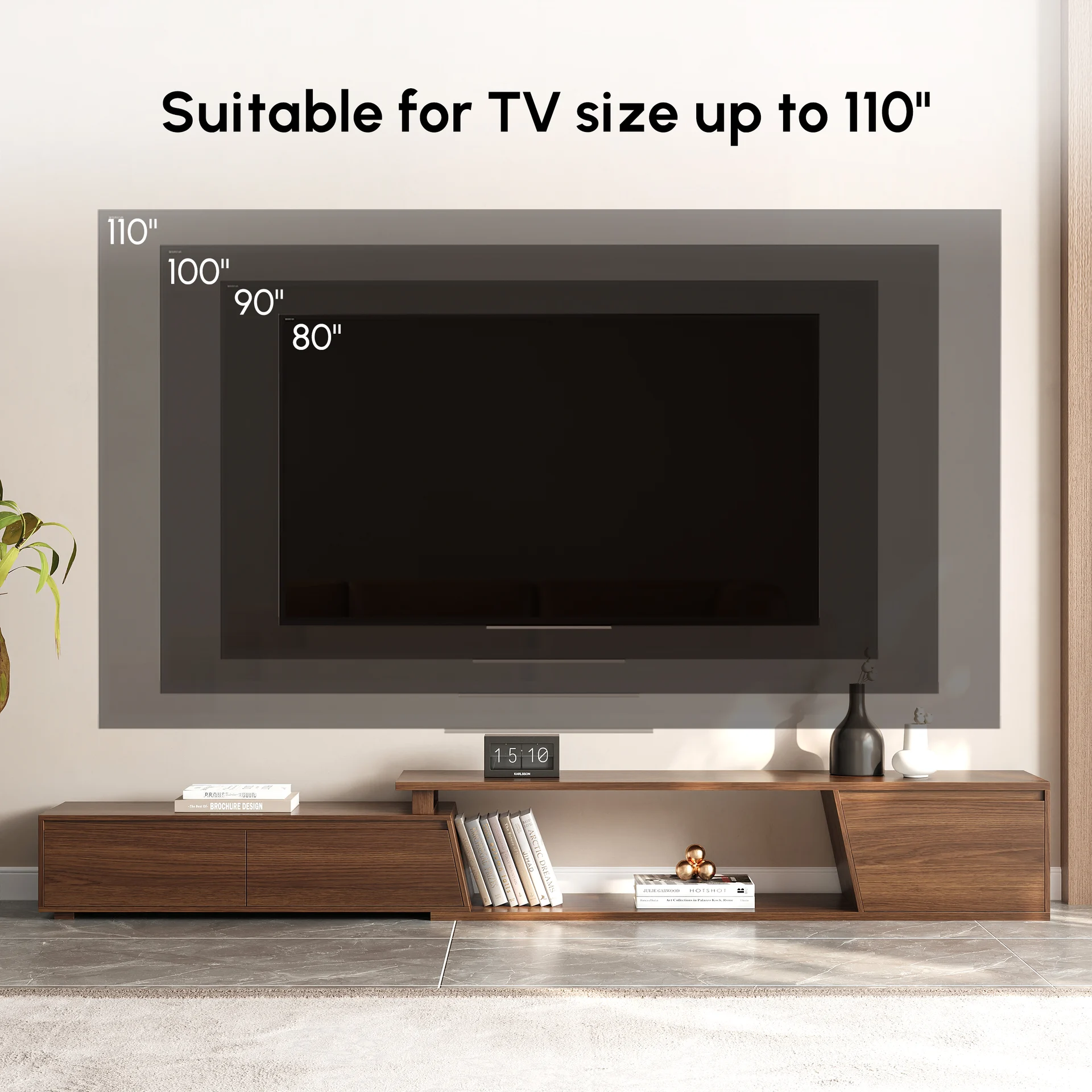 Fero TV stand features an extendable design and three spacious drawers, designed to complement TVs up to 110 inches in size. The extendable function provides great flexibility to fit various room layouts. This TV stand offers stylish decoration and practical storage options for contemporary living rooms. Note: The central storage area is not suitable for items weighing more than 22 lbs (10 kg).