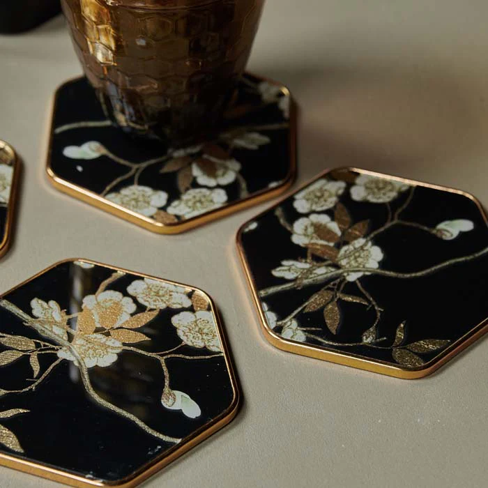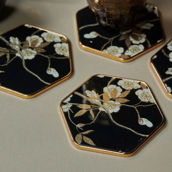 Protecting your surfaces has never looked more stylish than with this set of four patterned glass coasters with stunning golden details.