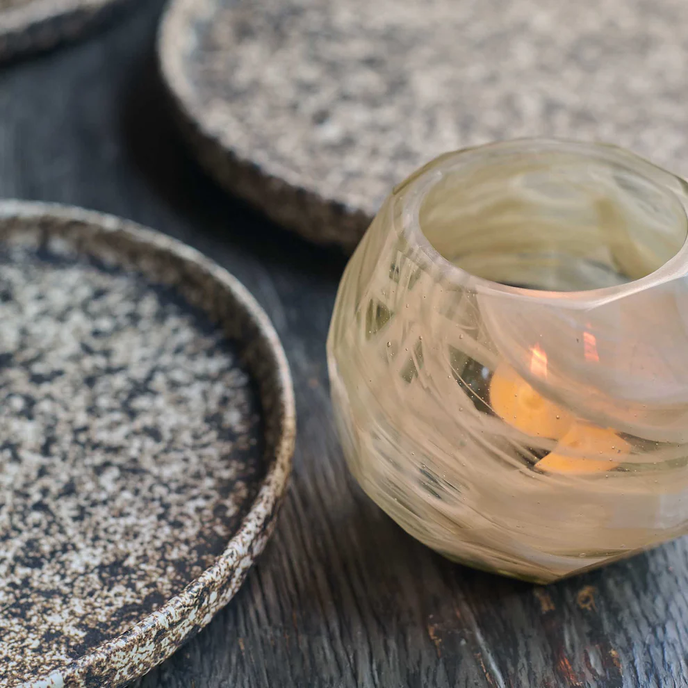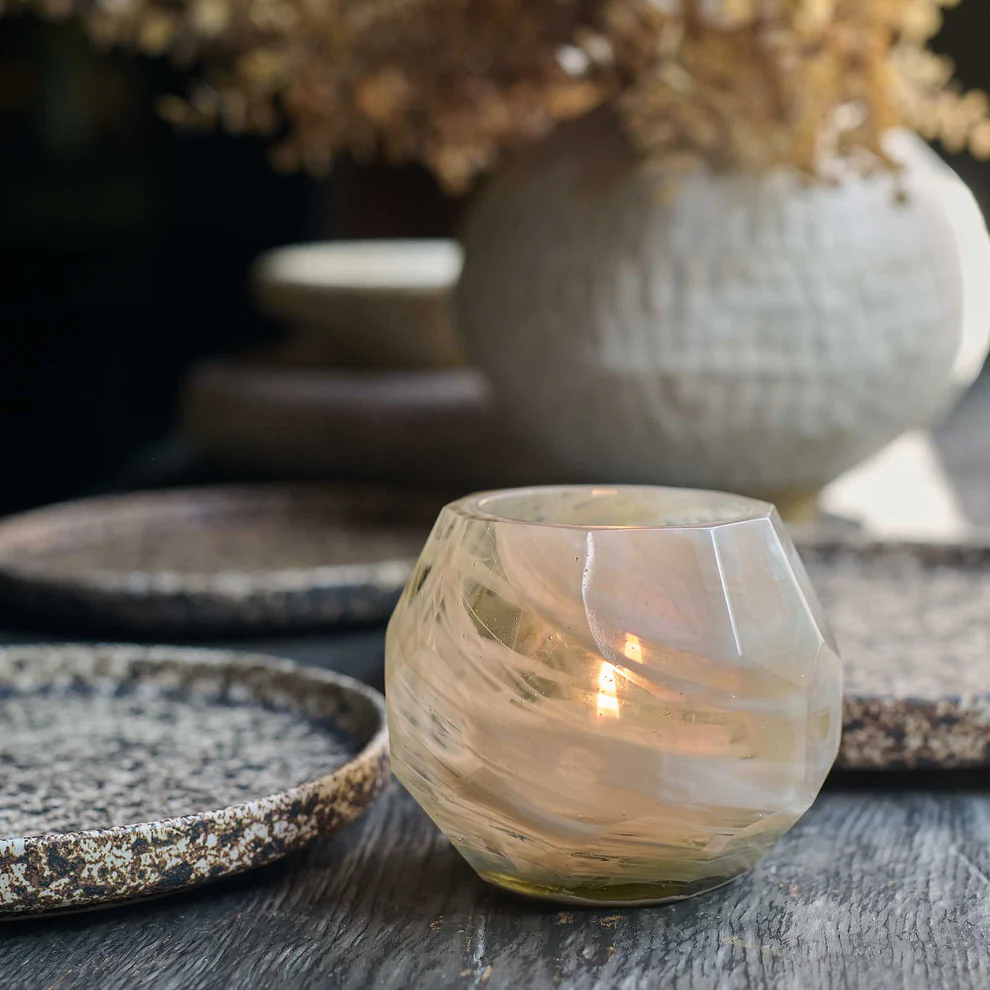With a hand cut, faceted finish and swirling patterns of smokey hues, our Oleander Glass Candle Holder is an elegant and timeless addition to any decor.